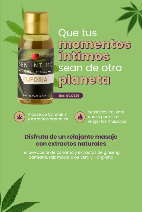 Aceite para masajes a base de cannabis, disfruta de un relajante masaje con extractos naturales, su sensacion caliente permitira relajar los musculos y disfrutar de un delicioso masaje con tu pareja.