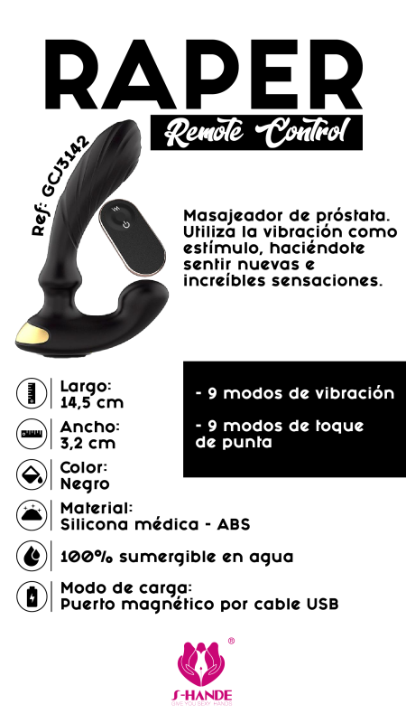 Tiene 9 modos de vibración, 9 modos de toque de punta, usa batería interna recargable a través de USB / enchufe. Con mando a distancia